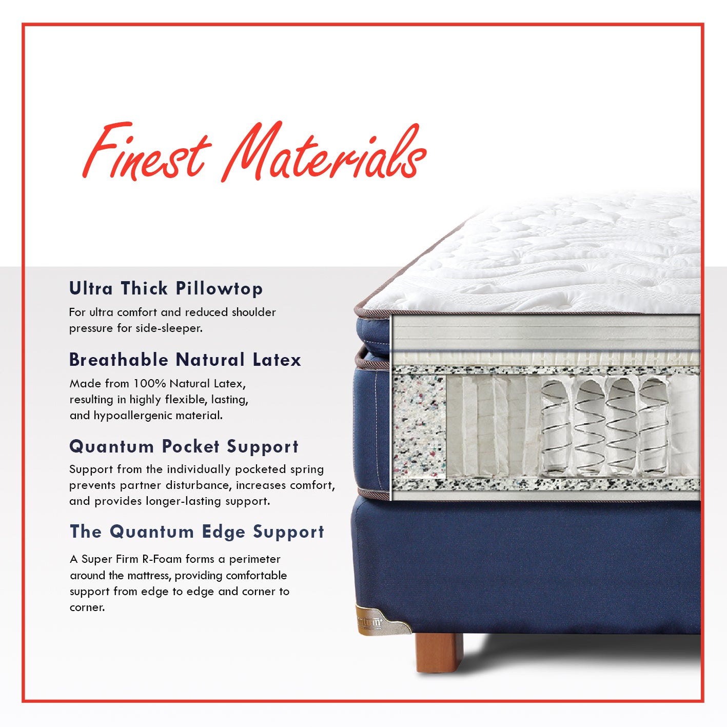 Seluruh tepi kasur diperkuat dengan Quantum Edging System, yaitu lapisan edging busa khusus yang menjaga pinggir kasur tetap kokoh dan tidak mudah kempis. Sistem ini menciptakan area tidur yang lebih luas dan stabil sehingga Anda bebas bergerak tanpa rasa khawatir.