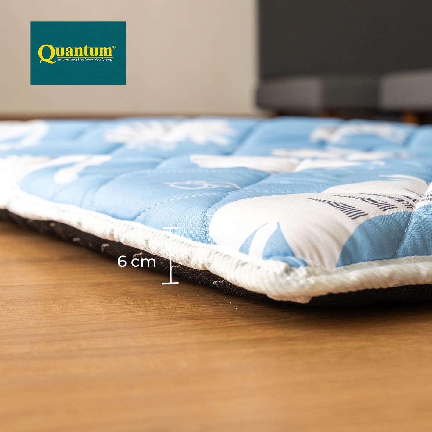 Lapisan anti-slip pada bagian bawah membantu kasur tetap di posisi saat dipakai, terutama di lantai keramik atau ruangan dengan permukaan halus. Material busa memberikan kenyamanan dasar untuk penggunaan harian, istirahat singkat, atau cadangan ketika ada tamu menginap. Motif quilting di bagian atas menambah tampilan kasur agar lebih rapi dan tidak mudah bergeser.