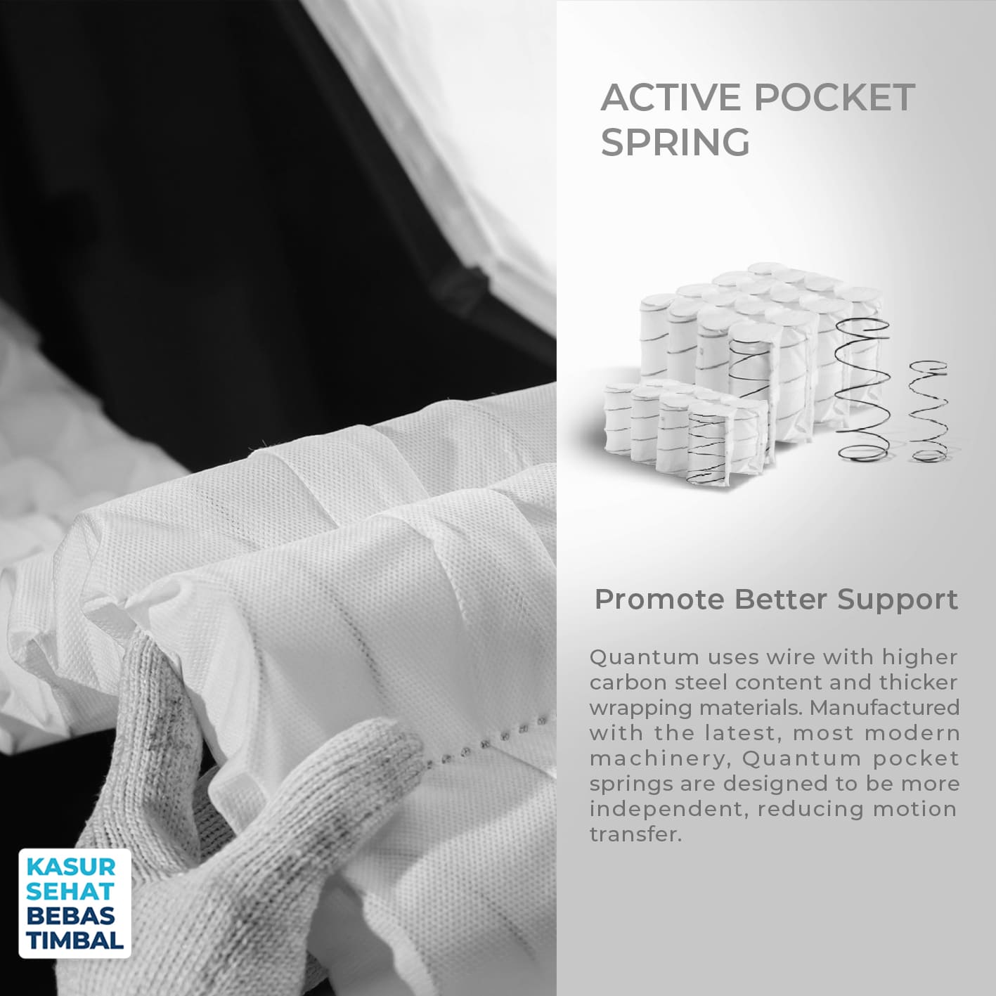 Menggunakan rangkaian pegas Pocket Spring yang bekerja secara independen. Setiap pegas bergerak sendiri sehingga dapat menyerap guncangan lebih baik dan mengurangi perpindahan gerak ketika pasangan Anda bergerak. Sistem ini memberikan topangan yang lebih presisi dan kenyamanan yang merata pada seluruh permukaan kasur.