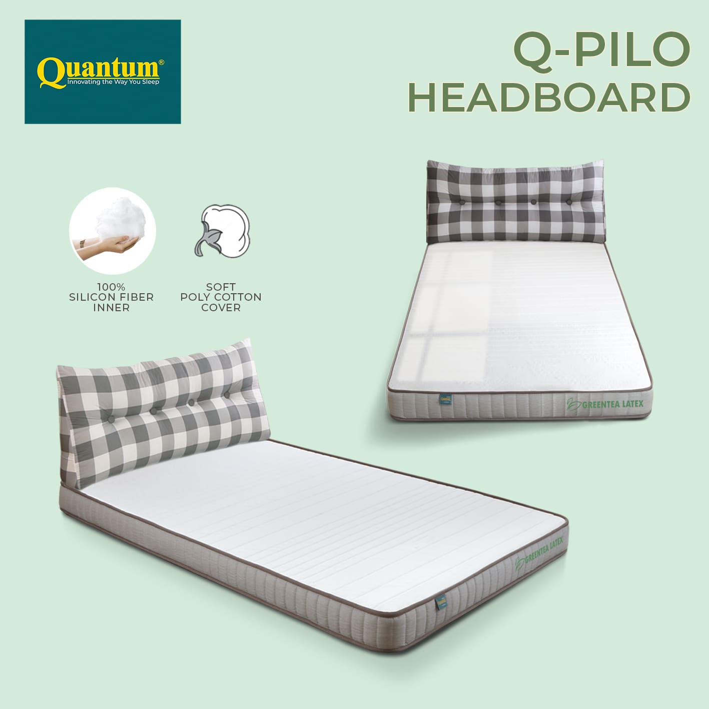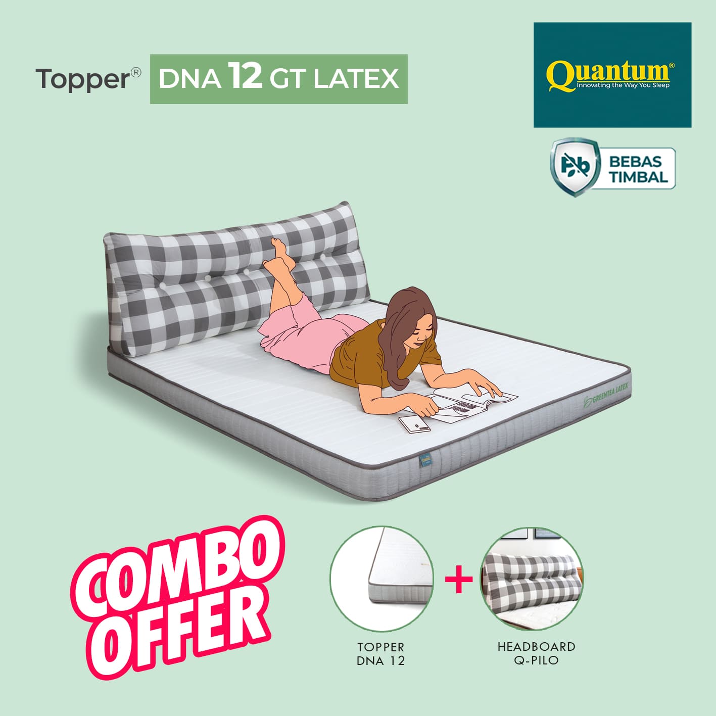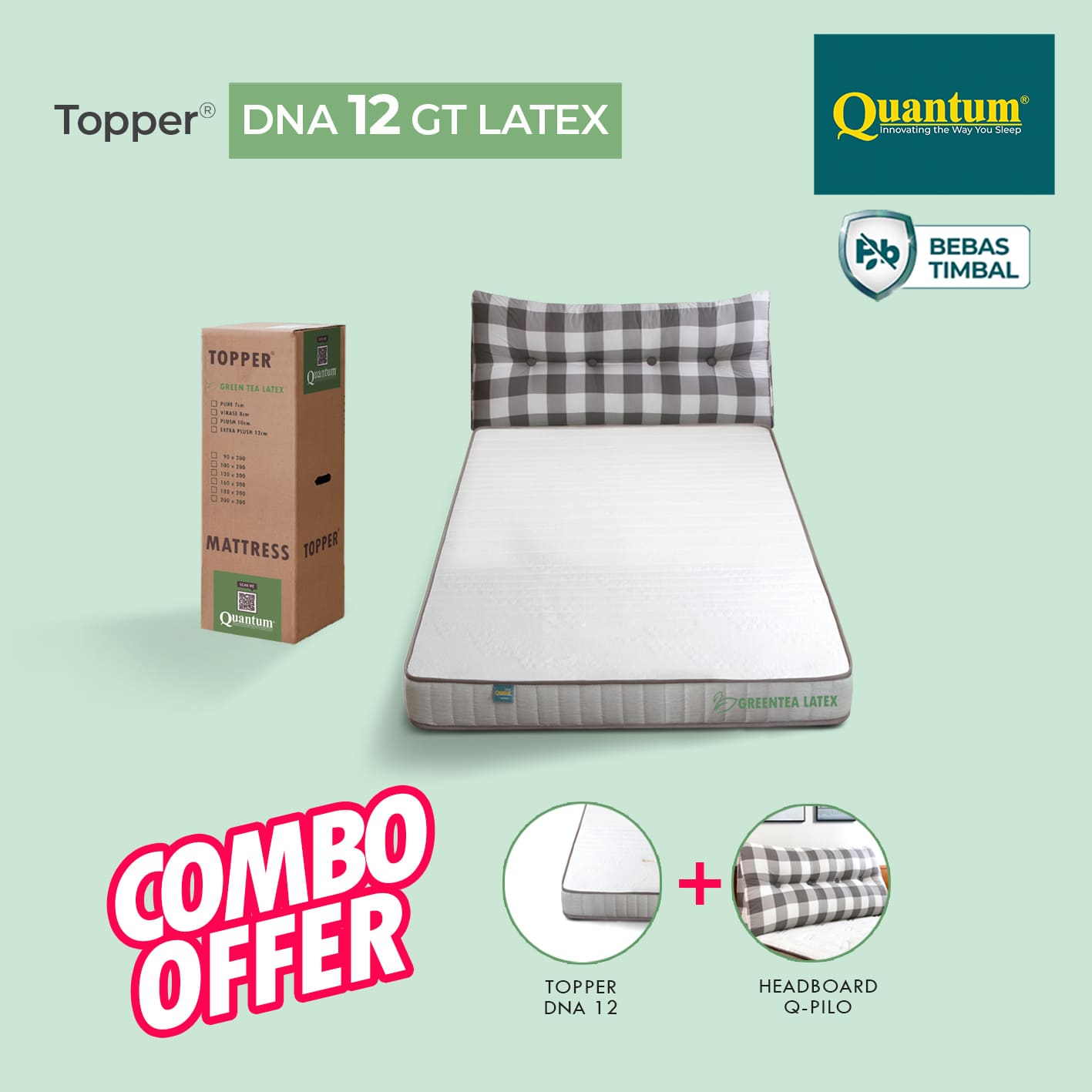 Topper Kasur 12cm Greentea Latex Anti-Slip + Q-Pilo dirancang sebagai tambahan kenyamanan yang mampu meningkatkan kualitas tidur secara signifikan. Lapisan latex berpadu dengan busa densitas tinggi memberikan permukaan tidur yang stabil, empuk, dan ergonomis. Topper ini membantu mengurangi tekanan pada bahu, pinggang, dan punggung sehingga tubuh bisa beristirahat lebih rileks. Tambahan Q-Pilo sebagai headboard multifungsi memberi kenyamanan ekstra saat membaca, bersandar, atau bekerja dari kasur. Solusi praktis untuk tidur lebih nyaman tanpa ganti kasur baru