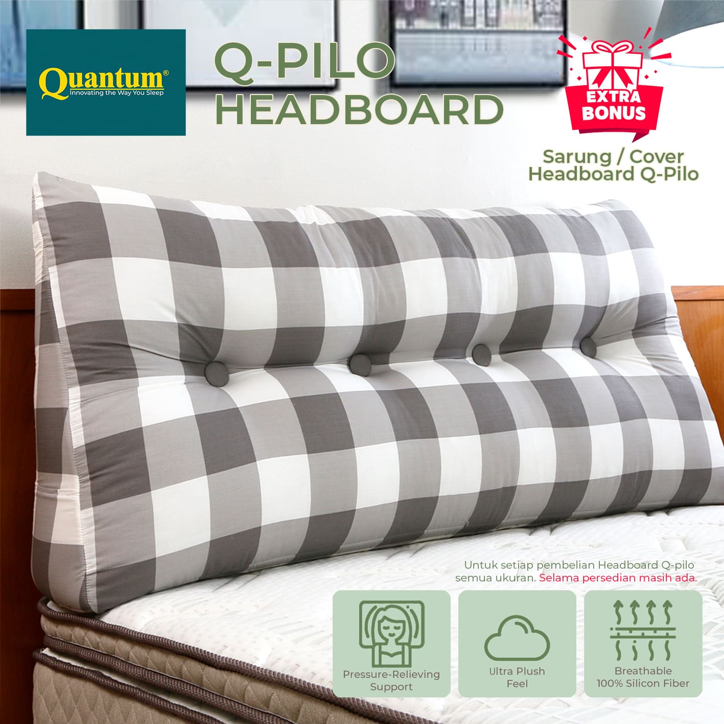 Tekstur lembut, breathable, dan nyaman untuk penggunaan harian. Struktur quilting menambah kekuatan material serta membantu sirkulasi udara agar tidak terasa panas saat tidur.