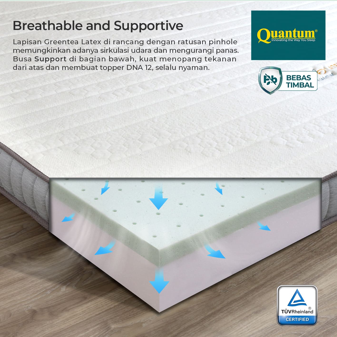 Desain lubang ventilasi membantu menjaga sirkulasi udara sehingga topper tetap sejuk dan tidak mudah lembab, ideal untuk iklim tropis.